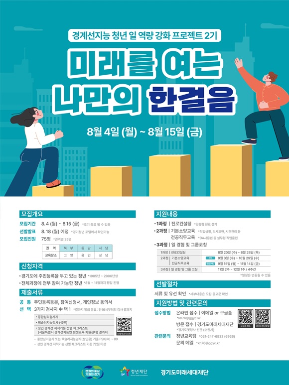 ¸ðÁý ´ë»óÀº °æ±âµµ¿¡ °ÅÁÖÇÏ´Â ¸¸ 19¼¼ºÎÅÍ 39¼¼±îÁöÀÇ Ã»³âÀ¸·Î, ºÏºÎ¡¤µ¿³²¡¤¼³² ±Ç¿ª¿¡¼ ¼±Âø¼ø ÃÑ 75¸íÀ» ¼±¹ßÇÑ´Ù. ¼±¹ßµÈ Âü¿©ÀÚ´Â ¾à 4°³¿ù°£ °úÁ¤º°·Î ±¸¼ºµÈ ÇÁ·Î±×·¥¿¡ Âü¿©ÇÏ°Ô µÈ´Ù.