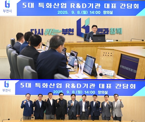 Á¶¿ëÀÍ ºÎõ½ÃÀåÀÌ 8ÀÏ ¿ÀÈÄ 2½Ã ½Ãû 5Ãþ âÀǽǿ¡¼ ±ÝÇü, Á¶¸í, ·Îº¿, ÆÐŰ¡, ¼¼¶ó¹Í µî 5´ë ƯȻê¾÷ °ü·Ã R£¦D(¿¬±¸°³¹ß) ±â°ü ´ëÇ¥µé°ú °£´ãȸ¸¦ °®°í 5´ë ƯȻê¾÷ ¹ßÀü ¹æ¾ÈÀ» ³íÀÇÇß´Ù. ¾Æ·¡´Â 5´ë ƯȻê¾÷ R&D±â°ü ´ëÇ¥µé°ú ±â³äÃÔ¿µ ¸ð½À.(»çÁø= ºÎõ½Ã Àç°ø)