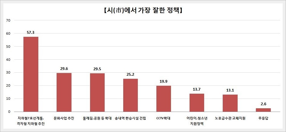 ºÎõ½Ã°¡ °¡Àå ÀßÇÑ Á¤Ã¥À¸·Î´Â 57.3%°¡ ¡®ÁöÇÏö 7È£¼± °³Åë ¹× °ÝÀÚÇü ÁöÇÏö ÃßÁø¡¯À» ²Å¾ÒÀ¸¸ç, ±× ´ÙÀ½À¸·Î´Â ¸¸È, ¿µÈ, »ýȰ¿¹¼ú µî ¹®È»ç¾÷ ÃßÁø(29.6%)°ú ºÎõµÑ·¹±æ, °ø¿ø µî È®´ë(29.5%)¸¦ ÀßÇÑ Á¤Ã¥À¸·Î Æò°¡Çß´Ù.