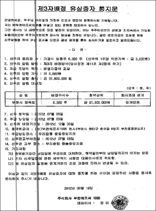 ºÎõ½ÃüÀ°È¸´Â Áö³ 7¿ù3ÀÏ ¢ßºÎõ¿¡ÇÁ¾¾(´ëÇ¥ÀÌ»ç Á¤ÇØÃá)ÀÇ ÁÖ½ÄÀ» Àý¹ÝÀÌ Á¶±Ý ¿ôµµ´Â 50.24%(6õ380ÁÖ)¸¦ 1ÁÖ´ç 5õ¿ø¾¿(3õ190¸¸¿ø)¸¦ ¸ÅÀÔÇß´Ù. ÀÌ¿¡ ´ëÇØ ¿øÁ¾Å ½ÃÀÇ¿ø°ú ÀϺΠ¾ð·Ð¿¡¼ ¡®ºÎõ½ÃüÀ°È¸ ȸÀåÀÎ ±è¸¸¼ö ½ÃÀå °³ÀÎÀÇ ¼ÒÀ¯°¡ ¾Æ´Ï³Ä¡¯´Â ÃëÁöÀÇ ¹®Á¦¸¦ Á¦±âÇß´Ù.