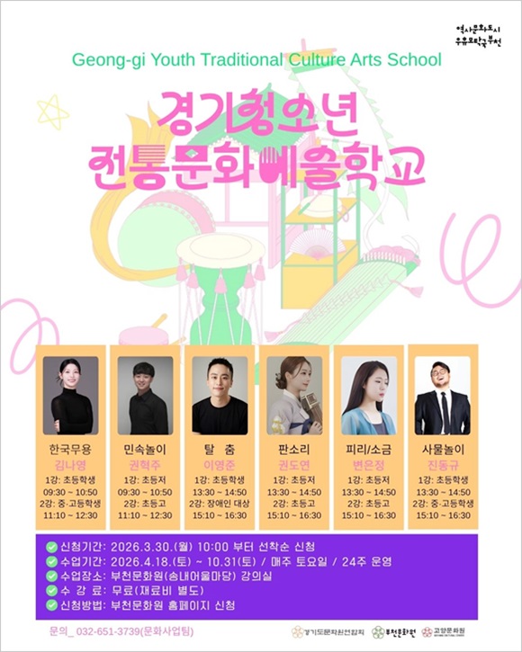 ºÎõ¹®È­¿ø(¿øÀå ±Ç¼øÈ£)Àº û¼Ò³âµéÀÇ ÀüÅ빮ȭ Âü¿© ±âȸ¸¦ È®´ëÇÏ°í °æ±âÁö¿ª ÀüÅë¹Î¼Ó¿¹¼úÀÇ Áö¼Ó °¡´ÉÇÑ Àü½Â ±â¹Ý ¸¶·ÃÀ» À§ÇØ ¿î¿µÇÏ´Â ¡®2026 °æ±âû¼Ò³âÀüÅ빮ȭ¿¹¼úÇб³¡¯ Âü¿© ÇлýÀ» ¸ðÁýÇÑ´Ù.