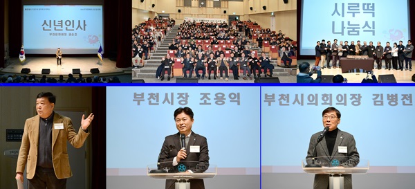 »çÁø À§ ¿ÞÂʺÎÅÍ ±Ç¼øÈ£ ºÎõ¹®È­¿øÀå ½Å³âÀλç, 2026 ºÎõ¹®È­¿ø ½Å³âÀλçȸ Âü¼®ÀÚ ±â³ÈÃÔ¿µ, ½Ã·çᄄᅠᆨ Àý´Ü ¹× ³ª´®½Ä. »çÁø ¾Æ·¡ ¿ÞÂʺÎÅÍ ±Ç¼øÈ£ ºÎõ¹®È­¿øÀå ¾ÆÁ¨´Ù ¼±Æ÷, Á¶¿ëÀÍ ºÎõ½ÃÀå, ±èº´Àü ºÎõ½ÃÀÇȸ ÀÇÀå Ãà»ç.(»çÁø= ºÎõ¹®È­¿ø Á¦°ø)