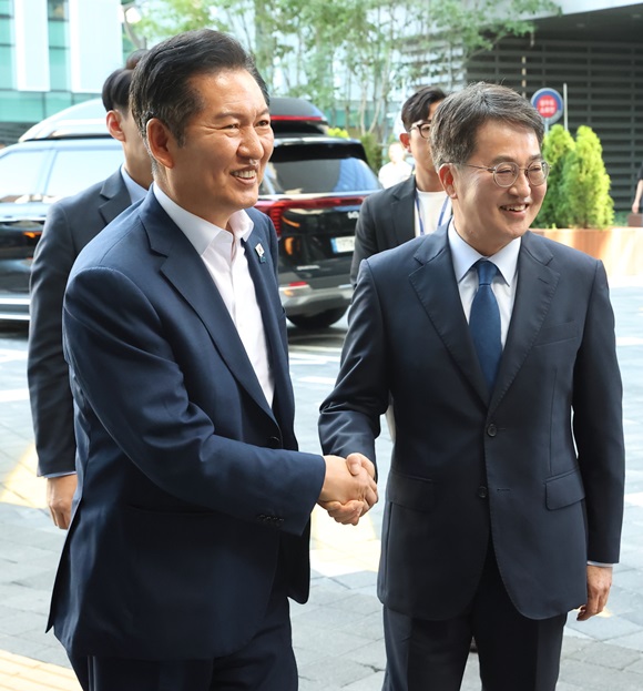 ±èµ¿¿¬ °æ±âµµÁö»ç°¡ 10ÀÏ ¿ÀÈÄ °æ±âµµ-´õºÒ¾î¹ÎÁÖ´ç ¿¹»êÁ¤Ã¥ÇùÀÇȸ¸¦ À§ÇØ °æ±âµµÃ» ¹æ¹®ÇÑ Á¤Ã»·¡ ¹ÎÁÖ´ç ´ëÇ¥¸¦ ¹Ý°©°Ô ¸ÂÀÌÇÏ¸ç ¾Ç¼ö¸¦ ³ª´©°í ÀÖ´Ù.(»çÁø= °æ±âµµ Á¦°ø)