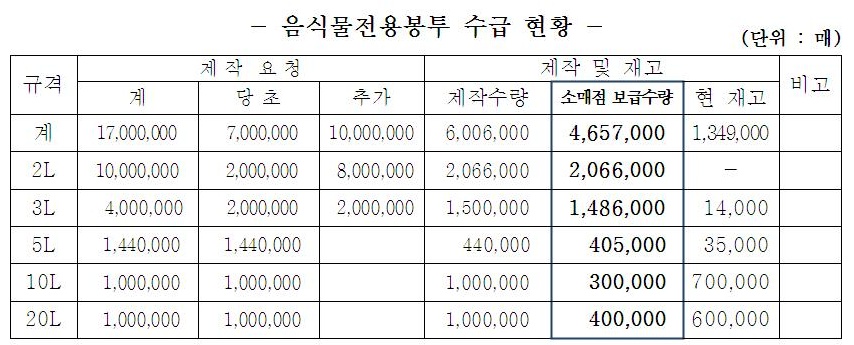 À± ´ÜÀåÀº À½½Ä¹°¾²·¹±â Á¾·®Á¦ Àü¿ëºÀÅõ °ø±Þ ºÎÁ·¿¡ ´ëÇØ¼´Â ¡°±×µ¿¾È ½Ã´Â Á¾·®Á¦ ½ÃÇà°ú °ü·ÃÇØ °¡Á¤¿¡¼ °¡Àå ¸¹ÀÌ »ç¿ëµÇ´Â 2¸®ÅÍ Àü¿ëºÀÅõ 200¸¸Àå, 3¸®ÅÍ 150¸¸Àå, 5¸®ÅÍ 44¸¸Àå µî ÃÑ 600¸¸ÀåÀ» Á¦ÀÛÇØ º¸±ÞÇßÀ¸³ª, °¡Á¤¿¡¼ ÀϽÿ¡ ´ë·® ±¸ÀÔ µîÀ¸·Î °ø±Þ·® ºÎÁ·Çö»óÀÌ ÀϽà ¹ß»ýÇß´Ù¡±°í ¹àÇû´Ù.