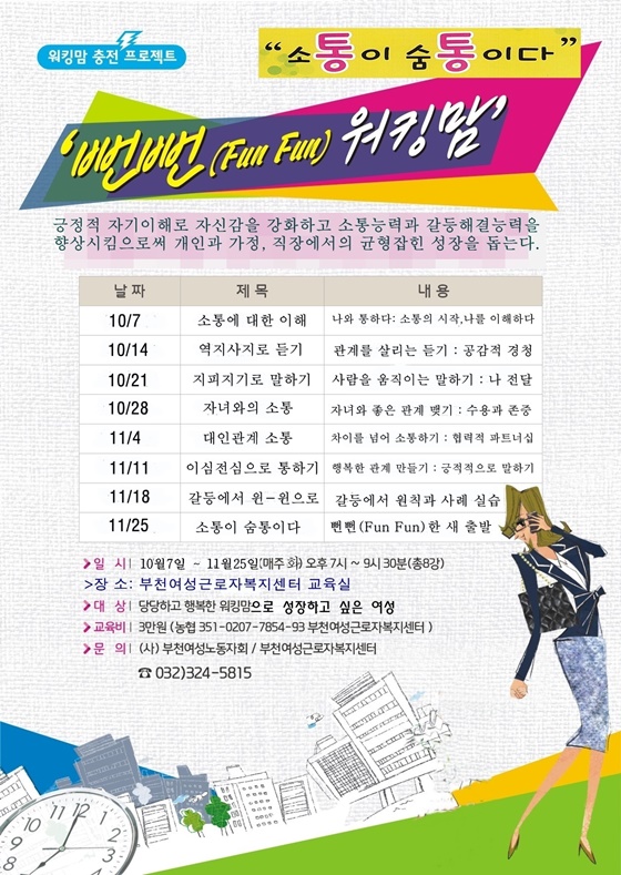 (»ç)ºÎõ¿©¼º³ëµ¿ÀÚȸ ºÎ¼³ ºÎõ¿©¼º±Ù·ÎÀÚº¹Áö¼¾ÅÍ´Â ÀÏÇÏ´Â ¿©¼º ÃæÀüÇÁ·ÎÁ§Æ® ¡®»·»· ¿öÅ·¸¾- ¼ÒÅëÀÌ ¼ûÅëÀÌ´Ù¡¯ ±³À°À» 10¿ù7ÀϺÎÅÍ 11¿ù25ÀϱîÁö ¸ÅÁÖ È¿äÀϸ¶´Ù ¿ÀÈÄ 7½ÃºÎÅÍ ¿ø¹Ì±¸ Áß1µ¿ 1144-4 ÇöÇØÅ¾ÇöóÀÚ 704È£ ±³À°½Ç¿¡¼ ½Ç½ÃÇÑ´Ù. Âü°¡ºñ´Â 3¸¸¿øÀÌ´Ù.